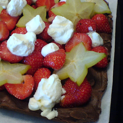 Koka upp 2 dl av grädden och smält chokladen i den. Vispa samman resten av grädden med mascarponen till halvfast konsistens. (Stöt snabbkaffepulvret.) Blanda allt och lägg i en lagom stor form, klädd med gladpack. Gör gärna ytan lite vackert toppig. Dekorera med vispad grädde och bär.
